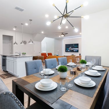 Spacious 8-seater dining table perfect for family meals, celebrations, or casual gatherings during your stay.
